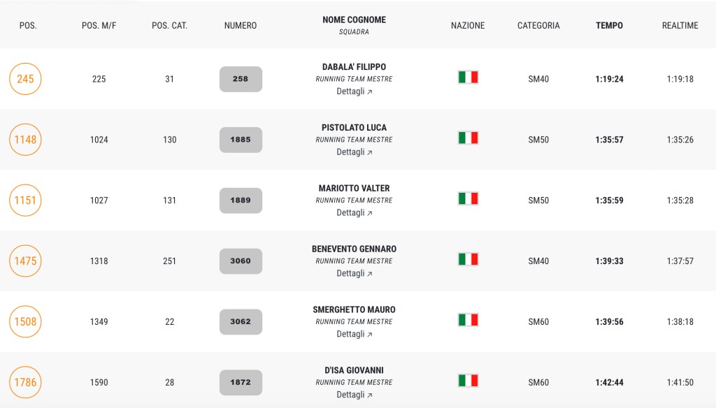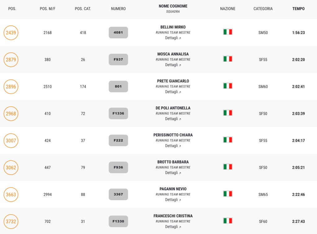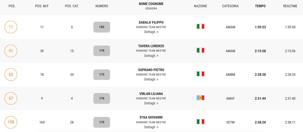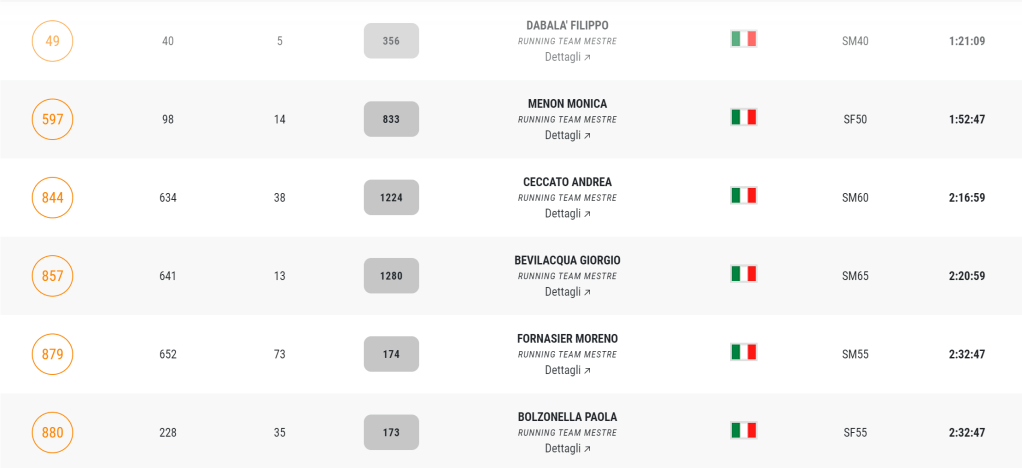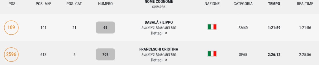 Segnaliamo l’undicesimo posto assoluto di Filippo Dabalà che chiude quinto nella sua categoria e il quarto posto di categoria di Liliana Virlan.