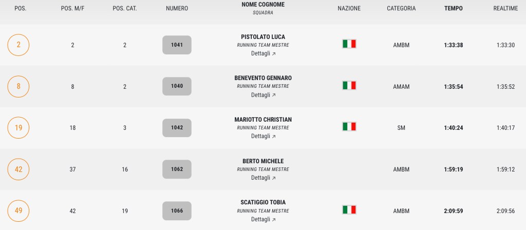 Al via della 21 Km competitiva 5 nostri atleti. Segnaliamo gli ottimi risultati di Luca Pistolato e Gennaro Benevento, secondi entrambi nelle loro rispettive categorie e di Christian Mariotto giunto terzo nella categoria SM.